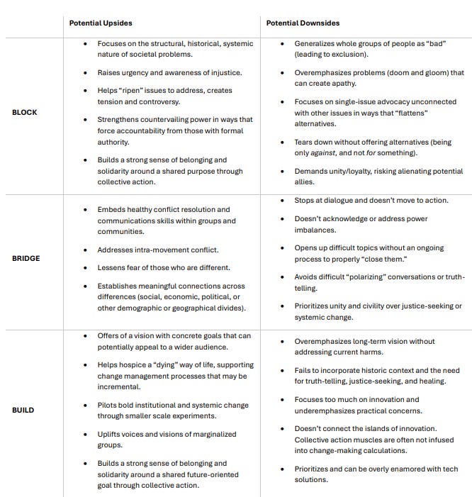 Applying polarities management to Block-Bridge-Build maps out some of the potential upsides and downsides of each approach. This exercise can help capitalize on the intended outcomes of our strategic choices and minimize unintended harmful impacts.